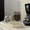 E' presente però un frigorifero e il bollitore con le tazze per bere caffè americano o the .
